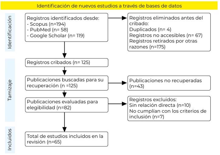 El proceso de selección se documentó mediante un diagrama PRISMA 15, que muestra el flujo de los registros desde la identificación inicial hasta la selección final (Figura 1).