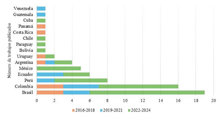 El análisis temporal de los estudios seleccionados (Figura 2), revela un aumento progresivo en la producción científica sobre modelos predictivos aplicados a la seguridad o soberanía alimentaria en Latinoamérica durante los últimos años. Entre 2016-2018 se identificó un número limitado de publicaciones, mientras que los períodos 2019-2021 y 2022-2024 muestran un incremento significativo, especialmente en países como Brasil y Colombia, los cuales concentran la mayor cantidad de estudios. Este crecimiento refleja un interés creciente en la región por abordar los desafíos de la seguridad alimentaria mediante enfoques tecnológicos y predictivos.