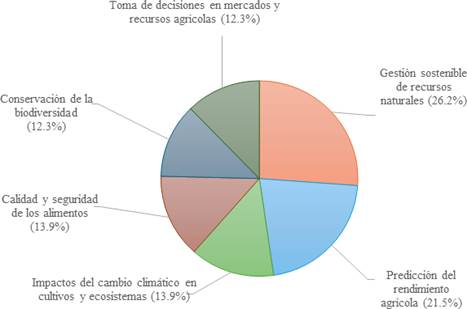 Los objetivos de los estudios analizados abarcaron una amplia gama de aplicaciones que pudieron agruparse en seis categorías principales (Figura 3). Una proporción significativa se centró en la gestión sostenible de recursos naturales, integrando innovaciones tecnológicas para optimizar el uso del agua, suelo y polinizadores. Otro grupo importante abordó la predicción del rendimiento agrícola, utilizando técnicas de aprendizaje automático e imágenes multiespectrales. Varios estudios exploraron los impactos del cambio climático en cultivos y ecosistemas, mientras que otros se enfocaron en la calidad y seguridad de los alimentos mediante análisis predictivos. Además, algunos trabajos buscaron desarrollar modelos para la toma de decisiones en mercados y recursos agrícolas, y la conservación de la biodiversidad bajo escenarios futuros.