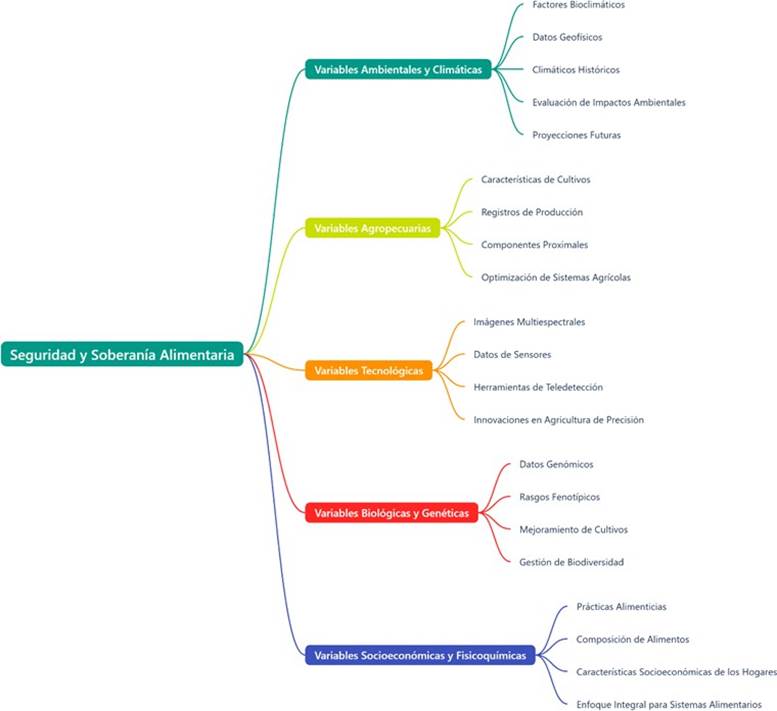 El análisis realizado permitió identificar y estructurar las principales categorías de variables empleadas en los estudios revisados, destacando la diversidad de enfoques aplicados para abordar la seguridad alimentaria (Figura 4). Estas categorías reflejan una integración multidimensional de datos, que van desde factores ambientales y climáticos hasta aspectos tecnológicos y socioeconómicos. Este enfoque no solo permite evaluar impactos específicos, como la variabilidad climática y la optimización de recursos agrícolas, sino que también facilita el diseño de estrategias integrales para mejorar los sistemas alimentarios.