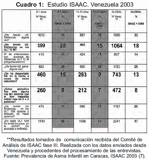 Según el ISAAC, la prevalencia del asma depende de cada lugar del mundo que se evalúe, es decir, presenta una elevada variabilidad. Las mayores prevalencias de síntomas de asma, más del 30%, se observan en Reino Unido, Nueva Zelandia, Australia e Irlanda y las más bajas en Indonesia, Rusia y Albania. En Iberoamérica, este estudio indica que España, Portugal, México, Chile y Argentina tienen una prevalencia del 5 al 10%; Uruguay, Panamá y Paraguay del 15 al 20%, y por encima de este porcentaje están Perú, Costa Rica y Brasil. (3,4,6). El estudio ISAAC en Venezuela (2003) se realizó por encuesta en la población escolar de 6 a 7 años y estudiantes de 13 y 14 años de colegios públicos y /o privados de la zona sur, sur oeste y oeste de la ciudad de Caracas, con un total de 6000 entrevistas. Los resultados revelaron prevalencia de sibilancias de 35% (1.012 pacientes) de la población de 6 a 7 años y 30% (887 pacientes) en la población de 13 a 14 años (Cuadro 1) con un total de 32% de prevalencia de sibilancias (1899 pacientes) (7).