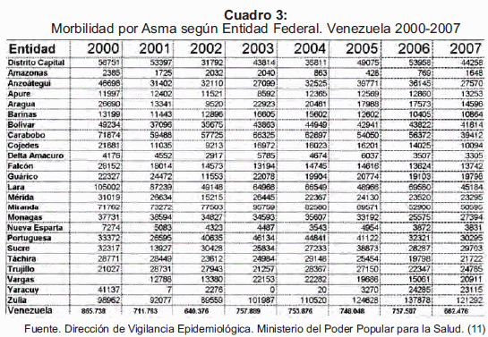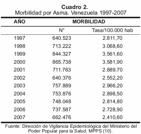 Al evaluar la Tasa de Morbilidad por Asma, según datos de la Dirección de Vigilancia Epidemiológica del Ministerio del Poder Popular para la Salud (MPPS) (8), observamos que desde el año 1997 al 2007, la tasa de morbilidad nacional se mantiene más o menos estable (Cuadro 2). Los datos reportados en los archivos de la morbilidad registrada en los establecimientos de atención médica del MSDS- Venezuela año 2000, señalan que para ese año, el asma ocupaba el segundo lugar como motivo de consulta con un total de 865.738 casos y tasa de 3.581,9 por 100000 nacidos vivos (8); Para el año 2007 pasó a ocupar el quinto lugar como motivo de consulta según informe EPI-15 del MPPS año 2007, con el total de casos de 662.476 y una tasa de 2,4/100.000 habitantes (9).
