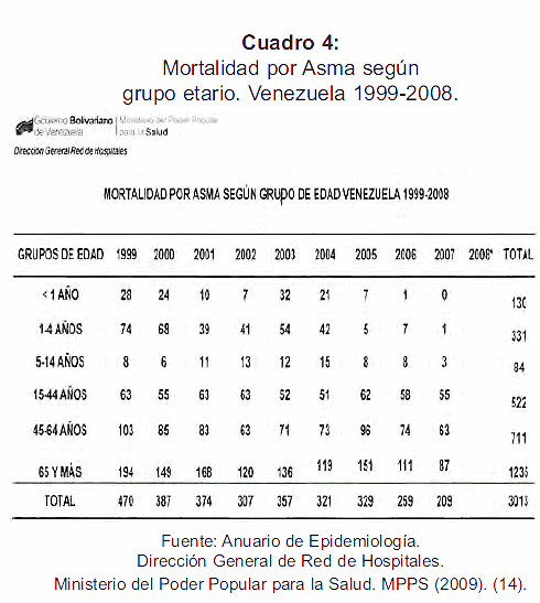 14.- Ministerio del Poder Popular Para la Salud. Dirección general Red de Hospitales. Anuario de Epidemiología. Mortalidad por asma según grupo de edad 1999-2008. Caracas, 2009. [ Links ]