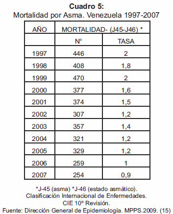 Los estudios también han demostrado que más del 80% de las muertes por asma ocurre en países de bajos ingresos. En Estados Unidos el asma es responsable de más de 1,5 millones de emergencias, de unas 500.000 hospitalizaciones y de casi 5.000 muertes cada año. En la última década, las tasas de mortalidad se han estabilizado o han disminuido gradualmente en diferentes países, sobre todo en Reino Unido, Estados Unidos y Australia. Investigaciones realizadas en Argentina, México, Brasil, Chile, Colombia, Perú, Uruguay, Venezuela y España, muestran una tendencia parecida, con un alto porcentaje de muertes en mayores de 50 años y con riesgo cardiovascular; otros estudios muestran que la mortalidad por asma está asociada con el bajo uso de servicios de emergencia (12,13). En la revisión de los archivos de la Dirección de Vigilancia Epidemiológica del MPPS, la mortalidad por asma según los grupos etáreos durante los años 1999 al 2007 va en descenso (Cuadro 4) reportando, el mayor número de muertes en los mayores de 45 años (14). Según los datos reportados en el libro de Clasificación Internacional de Enfermedades (CIE- 10) del MPPS la tasa de mortalidad por asma (J45 asma) y (J46 estado asmático) (Cuadro 5) presenta descenso en el transcurso de los años 1997 al 2007 (15).