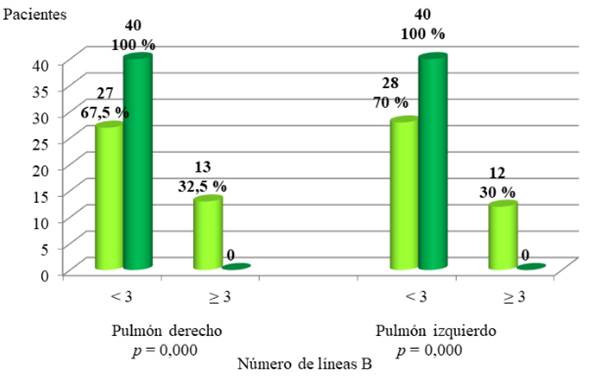 En la gráfica 2 se presentan los resultados para la detección del síndrome intersticial pulmonar usando ecografía en cada pulmón. En el campo pulmonar derecho, en el grupo con preeclampsia grave, se encontró la presencia de 3 o más líneas B en 13 puérperas (32,5 %) mientras que todas las sanas tuvieron menos de 3 líneas B (p = 0,000). En el campo pulmonar izquierdo, hubo 12 (30 %) puérperas en el grupo de preeclámpticas con signos de gravedad que presentaron 3 o más líneas B y entre las sanas, ninguna presentó este número (p = 0,000).