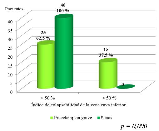 Los cambios del volumen intravascular efectivo a través de la evaluación del índice de colapsabilidad de la vena cava inferior se muestra en la gráfica 3. Se observó la disminución en el índice de colapsabilidad de la vena cava inferior menor al 50 % en 15 preeclámpticas (37,5 %) y en ninguna sana (p = 0,000).