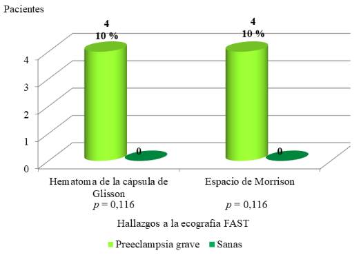 En la gráfica 4 se incluyeron los resultados del estudio de ecografía FAST. No se observaron signos compatibles con cambios en el parénquima hepático ni en el espacio esplenorrenal en ninguna paciente. Hubo 4 pacientes con hematoma de la cápsula de Glisson (10 %) y 4 con presencia de líquido libre en el espacio de Morrison (10 %), ambos signos en pacientes con preeclampsia grave. Todas las pacientes sanas tuvieron resultados normales a la ecografía FAST (p = 0,116).