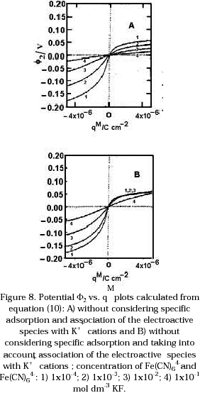 which is derived from the Gouy - Chapman theory of the diffuse double layer. The plots were calculated considering no association of the anion with the K+ cations (Figure 8a) and considering this association effects (Figure 8b). In this equation, ciS is the concentration of ions in bulk solution, and f2 is the potential in the outer-Helmholtz layer [19]. From these plots it is seen that when the electrode is charged positively, a high concentration of anions must be near to the electrode surface, which is reflected in the small values of ø2. If association of these electroactive species with the cations from the supporting electrolyte is considered, the concentration of these species near to the electrode surface is less with respect to the situation where no association is considered. This behaviour is also observed in the values of ø2 in Figure 8b.