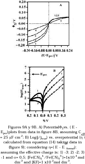 where jto is the true exchange current density, a is the cathodic transfer coefficient, z is the ionic valence of the oxidised species, f = F/RT, n is the number of electrons transfered. Figure 9B shows this behavior. It is seen that the theory predict that the cathodic current should be considerably hindered by double layer effects even taking into account the formation of ion-pair. Experimentally this effect was not as large as predicted in Figure 9B. The ion - pair species may be reacting faster than the free ferricyanide anions present near to the electrode- solution interface. The association constant of formation of ion - pair species may be different in the double layer from the association constant of these species in the bulk solution. The concentration of the ion - pairs species in equilibrium with the free association species may be affected in the double layer region due to the potential difference developed in the electrode - solution interface.