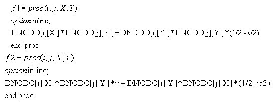 Por inspección de los procedimientos f1 y f2 se deduce que al aplicar f2(i,j,X,Y) y f1(i,j,X,Y) se obtienen las expresiones de los cuadrantes del sistema cartesiano I y II respectivamente y para obtener los cuadrantes III y IV se invierten las coordenadas cartesianas de (i,j,X,Y) por (i,j,Y,X), dejando constantes i,j que son los nodos en estudio de la submatriz para determinar los términos.