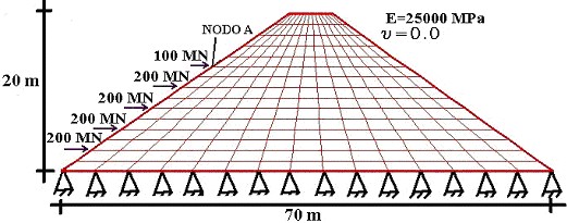 En la Figura 6 se presenta una presa de gravedad con carga lateral, discretizada con 72 elementos y 253 nodos y en la Figura 7 se presenta una cuarta parte de una placa simétrica con un hueco central, la cual fue discretizada con 80 elementos y 277 nodos. En ambos casos se toman elementos finitos subparamétricos de 8 nodos.