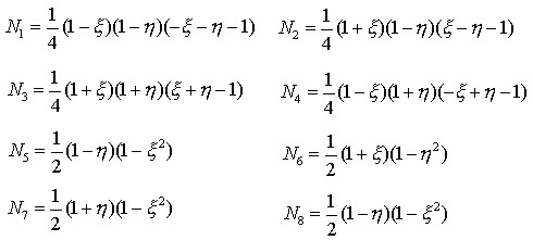 Al ubicarse en el plano adimensional (e,h) y tomando la formulación del método de elementos finitos, es necesario utilizar funciones de forma, las cuales definen la geometría y los campos de desplazamientos. Estas son función de las coordenadas adimensionales del elemento, una propiedad fundamental de estas funciones es la de tomar el valor "1" en el nodo en estudio y "0" en los demás nodos. En este trabajo se consideran funciones de forma del tipo Serendípity para un elemento finito de 8 nodos, (1).