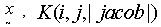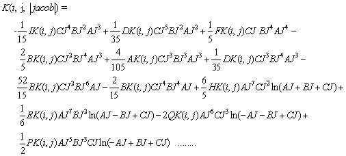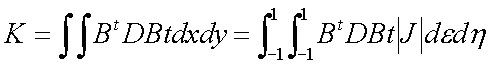 Esta ecuación general al integrarla respecto a las variables naturales (e,h) permite calcular todos los términos de la matriz de rigidez K, ésta matriz es función de los índices (i) y (j), del determinante del Jacobiano, (jacob) y de las coordenadas cartesianas del elemento,