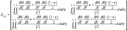 Por la interacción entre los nodos i y j, considerando 2 grados de libertad, (2 GDL), por nodo, se genera una submatriz de rigidez típica. Esta submatriz de rigidez típica contiene el resultado de las integrales de los productos de las derivadas parciales divididas entre el determinante del Jacobiano de la transformación (9).