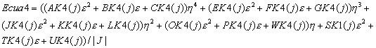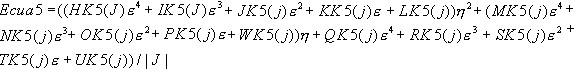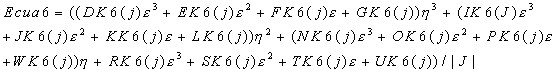 Las 6 ecuaciones presentadas se simplifican en una sola ecuación característica general, ésta ecuación general serán función de los índices (i) y (j), del determinante del Jacobiano,(jacob), de las variables naturales (e,h) y de las coordenadas cartesianas del elemento,