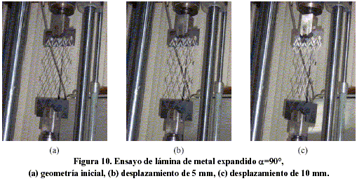 Las probetas con una inclinación de 90° se caracterizan por poseer el eje mayor del diamante alineado con la dirección de carga. (Figura 10 a). La Figura 10 muestra la secuencia redesplazamiento a: (a) 0 mm, (b) 5 mm de elongación y (c) 10 mm de elongación.