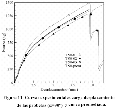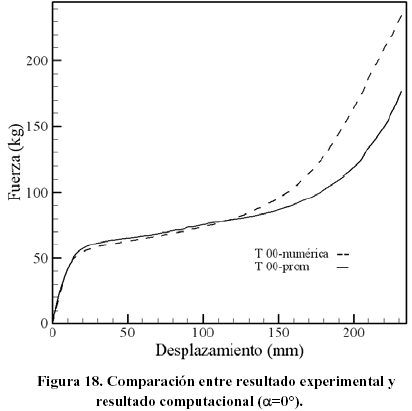 La Figura 21 muestra las curvas carga desplazamiento promediada experimental y numérica para a=90°. La curva experimental posee valores menos elevados que la curva numérica durante la primera etapa (que corresponde a la zona de comportamiento elástico del material, para después ajustarse mucho mejor durante la fase de endurecimiento, esta diferencia en la primera etapa del ensayo experimental con relación al ensayo numérico se puede atribuir a cierta ortotropía del material, la cual fue medida por Sánchez (2005).