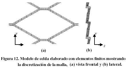 Otro importante resultado de este trabajo es el desarrollo de un modelo por elementos finitos que permite simular apropiadamente el comportamiento de mallas de metal expandido.