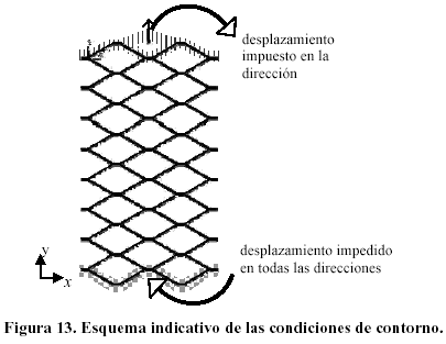 La malla fue anclada en un extremo, impidiendo el desplazamiento de los nodos en todas las direcciones. Se definió una ecuación de restricción cinemática en el extremo opuesto imponiendo un desplazamiento uniforme en la dirección longitudinal de 1 mm en cada paso. Para cada modelo se impuso un desplazamiento total igual al desplazamiento total promedio obtenido en los ensayos experimentales. Las condiciones se muestran esquemáticamente en la Figura 13.