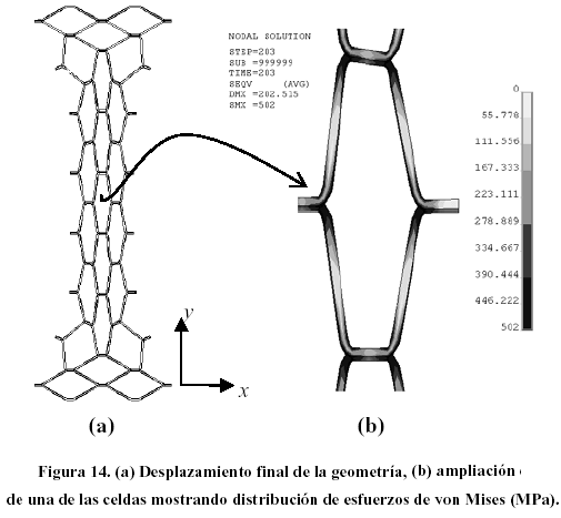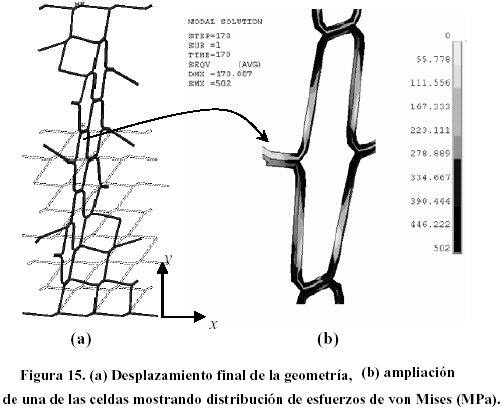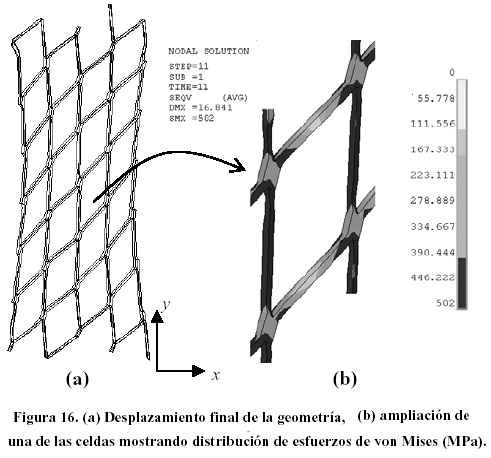 El modelo analizado posee 3840 elementos. Para esta configuración el análisis cuasi-estático culminó después de 235 pasos de carga, imponiendo en cada uno un desplazamiento alineado con el eje principal Y de 1 mm. La geometría final del modelo numérico en función del desplazamiento final se muestra en la Figura 14 (a). La Figura 14 (b) muestra una ampliación de una de las celdas centrales del modelo, se observa la exagerada deformación de la celda, aumentando la longitud de la diagonal menor hasta casi dos veces su tamaño. La distribución de grises corresponde con el esfuerzo de von Mises. En esta también se observa una concentración de esfuerzos en las uniones entre los nodos y las venas que corresponde ampliamente con los resultados experimentales pues la rotura de la malla siempre se produce en esta zona.