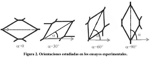 A continuación se presentan los procedimientos utilizados para el estudio del comportamiento de mallas de metal expandido ensayadas en diferentes orientaciones con respecto al eje mayor de la celda (Figura 1). Con esto se pretende estudiar experimentalmente el comportamiento estructural de las mallas de metal expandido al ser sometidas a cargas de tracción en diferentes direcciones.