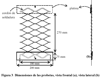 Las mallas fueron soldadas en sus extremos sobre una pletina de acero rígida de dimensiones 200x100x3 [mm], esto con el fin de minimizar la concentración de esfuerzos en el punto de aplicación de las cargas, la altura libre promedio fue de 270 mm y el ancho libre varió entre 170 y 180 mm (Figura 3). La soldadura se realizó por arco eléctrico, con electrodos E6013 de 3/32 diámetro. Para ello se utilizó una máquina Miller Electric MFG, Modelo 250 AC/DC. La Figura 3 muestra esquemáticamente una probeta orientada a cero grados.