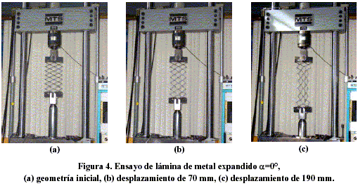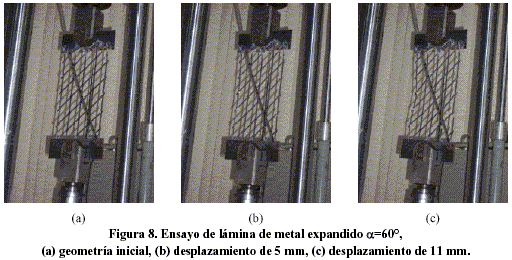 Las probetas con una inclinación de 30° se caracterizan por poseer una de las aristas del diamante perpendiculares a la dirección de la carga aplicada (Figura 6 a). Las Figura 6 muestra la secuencia de desplazamientos durante el ensayo en: (a) 0 mm, (b) 70 mm de elongación y (c) 180 mm de elongación.