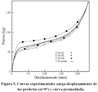 La Figura 7 muestra las curvas carga desplazamiento. Se observa una diferencia considerable en estas curvas, debido a la dificultad de reproducir exactamente las condiciones de contorno en los extremos de las probetas con el cordón de soldadura. El número de celdas soldadas en las pletinas y el área efectiva de la soldadura se modificó en cada probeta ya que la configuración de la malla varió ligeramente durante el proceso de fabricación. En la figura 6(c) se observa que la pletina inferior sólo tiene soldada una celda, mientras que en la pletina superior se lograron soldar dos celdas.