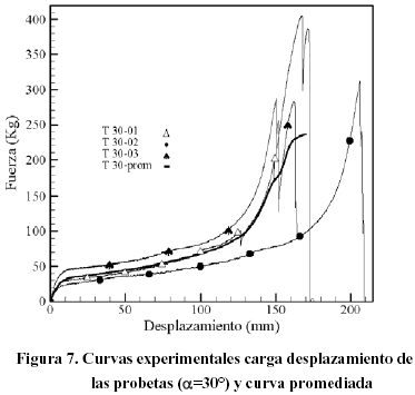 La Figura 19 muestra las curvas carga-desplazamiento experimental promediada y numérica para las mallas orientadas a 30 grados. Al igual que en el caso anterior, la similitud de las mismas es notable hasta un desplazamiento de 120 mm, a partir de este punto las curvas se separan considerablemente, sin embargo, a diferencia del resultado anterior, la zona de endurecimiento (aumento brusco de la carga) de la curva experimental alcanza valores elevados más rápidamente que la curva numérica.