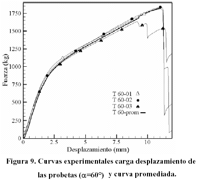 Se calculó una curva carga desplazamiento promediada con los resultados de las tres probetas (Figura 9), hasta el primer punto de rotura del material (en el resultado promedio). En este caso, la curva promediada se desarrolló hasta un desplazamiento de apenas 11 mm. A partir de un desplazamiento de 9 mm la probeta T 60-03 no es tomada en el promedio, pues se rompió un nodo perteneciente al cordón de soldadura. La energía acumulada de la curva promedio es de 132.97 J y una carga media de 1232.27 kg. La variación longitudinal de la geometría es de un 4.1%. Esta probeta, debido a su configuración posee mayor área efectiva de sección transversal, pues como se puede observar, el número de venas (alineadas con la dirección de la carga) es de cinco. La carga es trasmitida prácticamente a través de las venas.