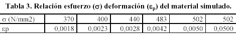 Se realizó un análisis cuasi-estático de las mallas ensayadas experimentalmente, para ello se desarrolló un modelo de elementos finitos para cada orientación, utilizándose el software Ansys (Ansys, 2002) tanto para el desarrollo del modelo como el cálculo y el postproceso. Se tomaron en cuenta ciertas no linealidades concernientes al modelo, como la no linealidad geométrica (para ello se resolvió el modelo tomando en cuenta las grandes deformaciones en las opciones de solución) y la no linealidad en el comportamiento del material, para lo cual se definió una curva multilineal elástica obtenida de Sánchez (2005). Los valores de dicha curva se muestran en la Tabla 3.