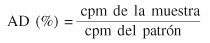 donde AD: actividad dosificada, cpm de la muestra: cuentas/min en 1ml de plasma, y cpm del patrón: cuentas/min en 100µl de patrón × 1000, y