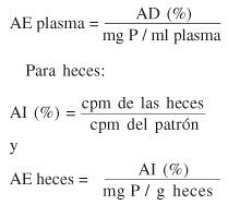 Para las estimaciones de la fracción metabólica fecal del P y consecuentemente de la absorción verdadera del elemento, se calculó, a diferentes tiempos, la actividad específica (AE) del 32P en plasma y heces, cuando esta alcanzó el estado de equilibrio. Para ello se utilizaron las fórmulas de Kleiber et al. (1951) y Underwood (1981):