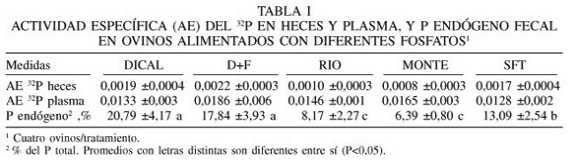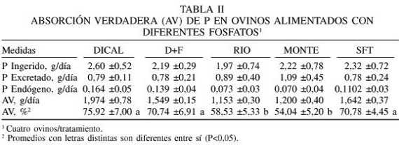 La excreción de P endógeno fecal (%), 6 días después de la dosificación de los animales, cuando la actividad específica del 32P en heces y plasma alcanzó la fase de equilibrio, fue más baja para RIO y MONTE, intermedia para SFT y mayor (P<0,05) para DICAL y D+F (Tabla I). La absorción verdadera de P (%), para las diferentes fuentes (AV, % en Tabla II) presentó valores superiores (P<0,05) para DICAL, D+F y SFT, y más bajos para RIO y MONTE.
