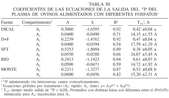 Las mayores pendientes de salida rápida (A1) se obtuvieron para SFT y DICAL, intermedias para D+F, y menores para MONTE y RIO. No se observaron diferencias entre las pendientes de la fase lenta (A2) de salida del 32P para las diferentes fuentes. Los tiempos medios (h) de salida rápida del 32P del plasma fueron menores (P<0,05) para SFT, DICAL y D+F, con relación a los fosfatos de roca de RIO y MONTE. Sin embargo, los tiempos medios (h) de salida lenta fueron similares para D+F, RIO, MONTE y DICAL, y ligeramente superior para SFT.