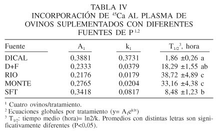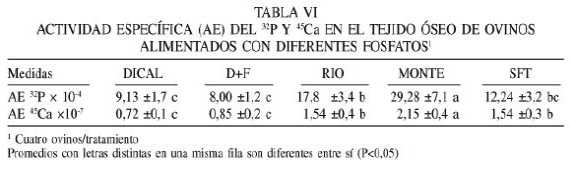 La captura de 32P y 45Ca por el hueso fue mayor (P<0,05) para MONTE, seguida por RIO y SFT e inferior (P<0,05) para DICAL y D+F (Tabla VI). En el caso particular de la captura de 32P por el tejido óseo, se encontró una relación inversa (P<0,05) entre ésta y la absorción verdadera del P (y= 82,53-1,04x; r= -0,90).