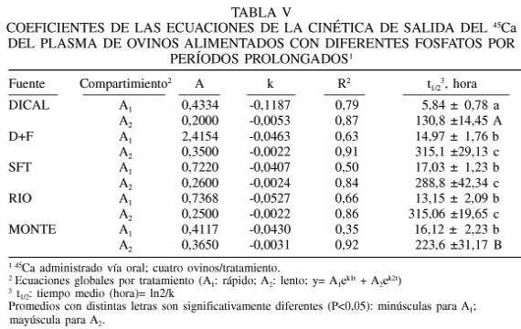 La tasa de salida y el tiempo medio (h) de la fase rápida (A1) del 45Ca del "pool" central del plasma hacia los diferentes compartimientos (Tabla V) fue mas rápida (P<0,05) en los animales alimentados con DICAL y mas lenta para SFT, D+F, y los fosfatos de yacimientos de RIO y MONTE. El tiempo medio de la fase lenta (A2) fue mas rápido (P<0,05) para DICAL, con relación a los fosfatos yacimientos de RIO y MONTE, y SFT y D+F.
