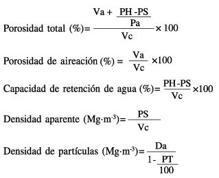 donde Va: volumen drenado (cm3), PH: peso húmedo de la muestra (g), PS: peso seco de la muestra (g), Pa: peso específico del agua (1g·cm-3), y Vc: volumen del cilindro o porómetro (cm-3).