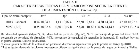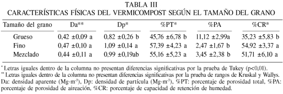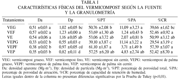 Las características físicas del vermicompost, densidad aparente, densidad de partículas, capacidad de retención de humedad, porcentaje de aireación y porosidad total son raramente reportados, a pesar de ser parámetros importantes al momento de caracterizar un abono orgánico para ser utilizado como componente de un sustrato de siembra. En las Tablas I, II y III se presentan los valores encontrados en los vermicompost evaluados, según los tratamientos, el tipo de alimentación de la lombriz (Eisenia spp.) y el tamaño del grano del vermicompost, respectivamente.
