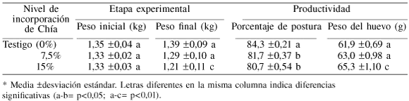 El resultado de la evolución del peso de las gallinas y de su productividad se muestra en la Tabla II. Las gallinas alimentadas con 15% HICh perdieron peso al final del período experimental (p<0,05). El porcentaje de postura disminuyó en relación al grupo testigo por efecto de la adición de HICh en la dieta (p<0,05). Otros autores han encontrado que el porcentaje de postura no se modificó por la inclusión de la Chía entera hasta un 28% (Ayerza y Coates, 2002). Aunque hubo disminución en la postura, el peso del huevo se incrementó (p<0,01) en los grupos con HICh, resultando en una productividad similar entre los tres lotes experimentales (p>0,05).