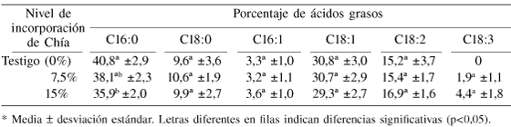 Los resultados de la composición lipídica (%) de la yema del huevo se presentan en la Tabla III. El contenido de C16:0 disminuyó (p<0,05) conforme se incrementó el porcentaje de Chía en el alimento, mientras que el resultado fue inverso para el C18:3, ya que se incrementó al pasar de ser indetectable hasta representar un 4,4%.