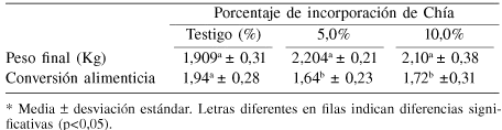 PESO FINAL Y CONVERSIÓN ALIMENTICIA DE POLLOS DE ENGORDA ALIMENTADOS CON HARINA INTEGRAL DE CHÍA*
