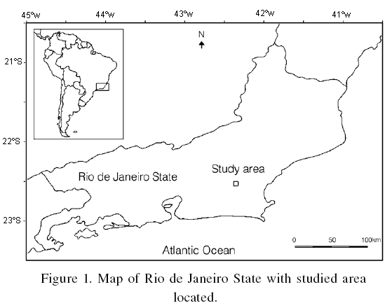 The study area is part of the Santa Helena farm (22o3156S and 42o2046W; Figure 1), located along the BR 101 federal highway in the municipality of Silva Jardim (RJ), ~5km from the Poço das Antas Biological Reserve (Rebio) in an area of Dense Ombrophilous Lowland Forest (IBGE, 1992). The forest fragment examined covers 4.25ha and is surrounded by agricultural and grazing areas. The regional climate is classified as As by the Köeppen system: rainy-tropical, with a winter dry season (Bernardes, 1952). Average annual rainfall and temperature are 1995mm and 25.5oC, respectively (Lima et al., 2006).