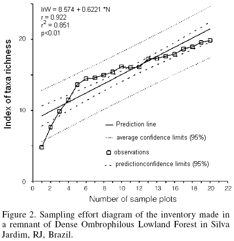 Sampling effort was measured by determining the simple linear regression line (Zar, 1999) of the accumulation of taxon richness (Whittaker, 1975) in regards to the accumulated number of observations (Loss and Silva, 2005), corresponding to the sequential implantation of the plots.