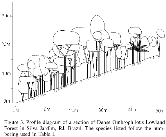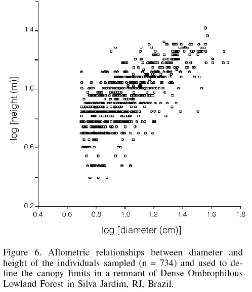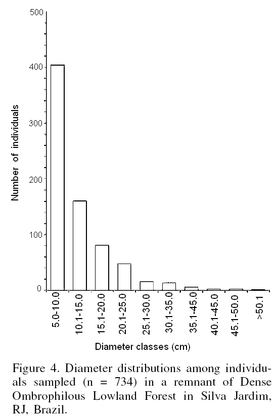 To evaluate the horizontal structure of the vegetation, frequency histograms of diameter classes at 5cm intervals were elaborated for all individuals encountered. The vertical structure, as a characterization of the forest layers studied, was evaluated based on the allometric relationships between diameter and height (log transformed; Sneath and Sokal, 1973), identifying the canopy with a dotted line as seen on the correlation diagram, and characterizing the canopy individuals as having a specified diameter and height, confirmed by verifying the first discontinuity among the points in the diagram (Guedes-Bruni, 1998).