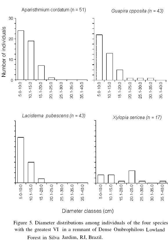 The three species with the greatest VI (A. cordatum, G. opposita and L. pubescens) also demonstrated an inverted J pattern (Figure 5) indicating, again, the process of natural regeneration in the fragment.