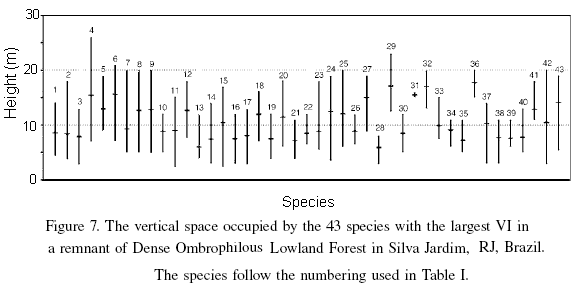 A graph was elaborated of the vertical space occupied by the sampled species that attained 75% of the VI. To determine the minimum number of classes, as well as their amplitude, the formula proposed by Spiegel (1977) apud Lopes et al. (2002) was used.
