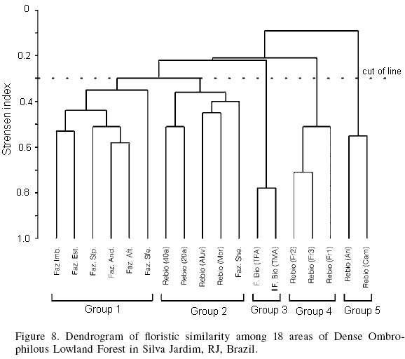 Any species only recorded at a single area was excluded from the list, as they do not cause any variation in the analysis. Based on the obtained matrix, Sorensens similarity coefficient was calculated for all the areas, forming a dendrogram by the UPGMA method. Calculations were performed utilizing the Fitopac 1 software package (Shepherd, 1995).