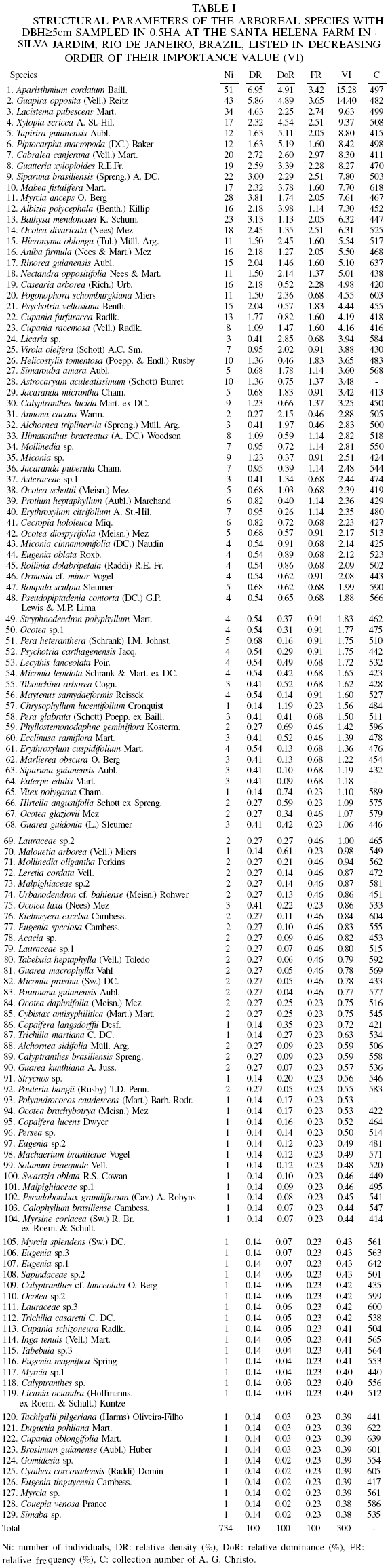 Among the sampled individuals were 129 species, subordinated to 41 families. The species, with their respective parameters, are listed in Table I in decreasing order of importance value (VI). Shannon-Wiener diversity index (H) was 4.22 and equitability (J) was 0.87.