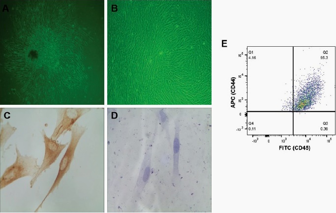 The inverted microscopy showed that hDPCs displayed clustered growth after seven days of adherent culture, primarily with a spindle-shaped morphology, while a smaller fraction of polygonal shapes (Fig. 1A). After passaging, the hDPCs adopted a vortex-like growth pattern, characterized by a more uniform, short spindle-shaped morphology with extending cytoplasmic processes (Fig. 1B). Immunocytochemical analysis was performed using passage 4 hDPCs, and showed positive staining for vimentin (Fig. 1C) and negative staining for cytokeratin (Fig. 1D), indicating their mesenchymal origin. Additionally, the flow cytometry analysis showed that the purity of hDPCs reached more than 95% (Fig. 1E). These morphological features were aligned with the typical biological characteristics of hDPCs.